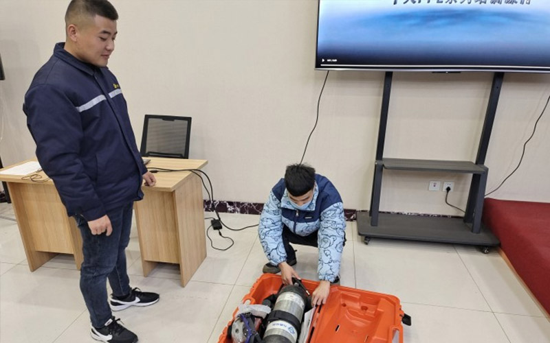 為便於廣大員工更易學會弄懂,培訓人員通過視頻講解、現場示範等形式多樣的教學模式,為員工講解正壓式空氣呼吸器使用前的檢查方法、正確佩戴方法以及日常維護保養方法等,並讓員工親自穿戴練習。